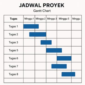 Kami menyusun timeline proyek menggunakan metode profesional (kurva-S, Gantt Chart), lalu memecahnya menjadi:
